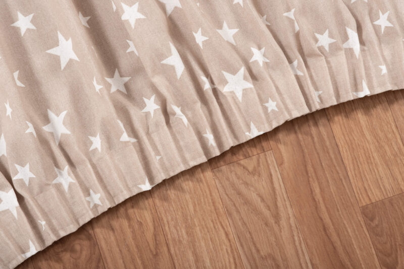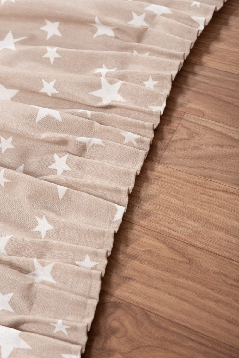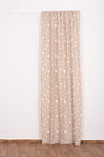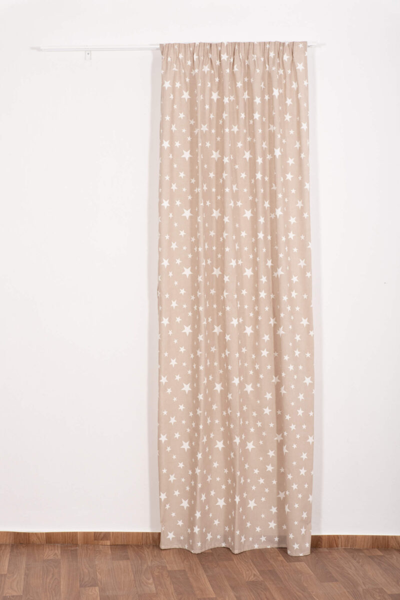 Κουρτίνα μπεζ με λευκά αστεράκια και σε αλλες 2 αποχρώσεις . Γεμάτο ύφασμα ,δεν διαφανίζει . Έτοιμη ραμμένη με τρέσα και γαντζάκια για να την κρεμάσετε σε σιδηρόδρομο ή κουρτινόξυλο.