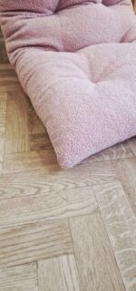Χειροποίητη μαξιλάρα δαπέδου πολλαπλών χρήσεων ιδανική για το παιδικό το βρεφικό δωμάτιο αλλά γιατί όχι και το καθιστικό . Το εξωτερικό ύφασμά της είναι από βαμβάκι 100% στην μία όψη και μονόχρωμο ανθεκτικό βελούδο στην πίσω όψη. Το εσωτερικό γέμισμα είναι πολυεστερική βάτα και τρίμα .Μπορεί να χρησιμοποιηθεί σαν μαξιλάρα δαπέδου αλλά και σαν μαξιλάρα σε παγκάκι ή σε ξύλινο κουνιστό παιχνίδι (rocker).