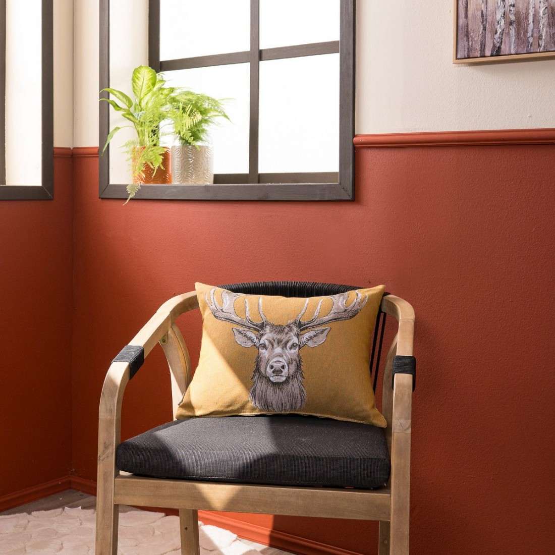 Ένα ιδιαίτερο ύφασμα στόφας με κεντημένη την μορφή του τάρανδου. Αρμονικοί συνδυασμοί χρωμάτων σε παστέλ αποχρώσεις. Πλένονται από την ανάποδη πλευρά στους 30 βαθμούς και σε χαμηλές στροφές. Διάσταση 37×48 .