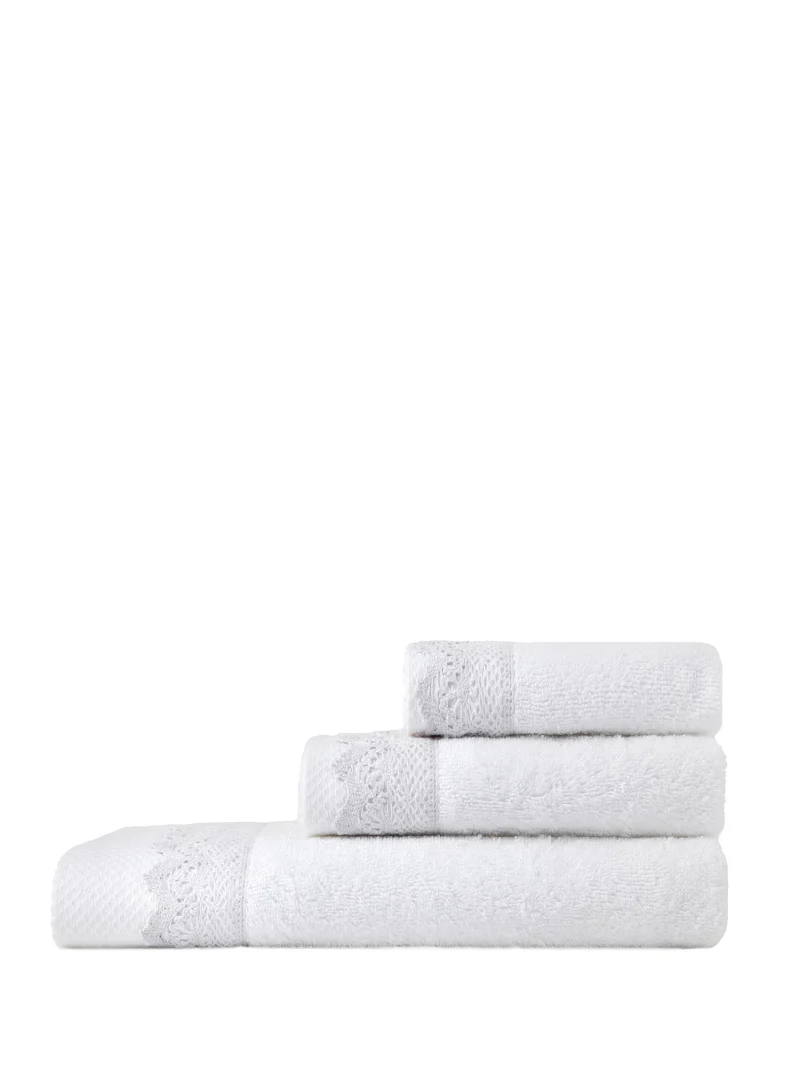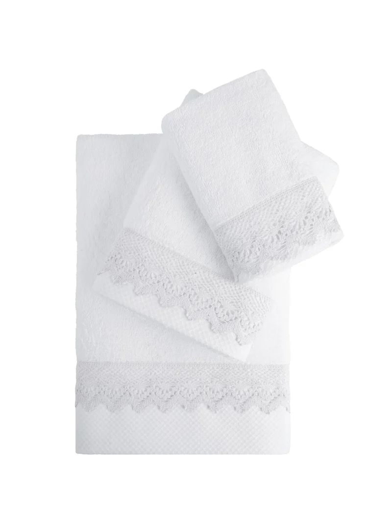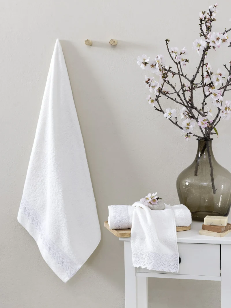 Σετ Πετσέτες με δαντέλα με σύνθεση από 100% βαμβάκι βάρους 480 gsm. Έχουν πλούσια, αφράτη υφή και εξαιρετικά απαλή αίσθηση. Χάρη στη βαμβακερή τους σύνθεση αναπνέουν φυσικά, είναι πολύ απορροφητικές, υποαλλεργικές και φιλικές προς το δέρμα. Προσφέρουν άνετο στέγνωμα μετά το ντους ή το μπάνιο. Είναι ιδανικές για να στολίσετε το μπάνιο σας αλλά και για χρήση καθώς έχουν μεγάλη αντοχή στον χρόνο καθώς διατηρούν το σχήμα και το χρώμα τους ακόμα και μετά από πολλές πλύσεις, χωρίς να απαιτούν ιδιαίτερη φροντίδα.