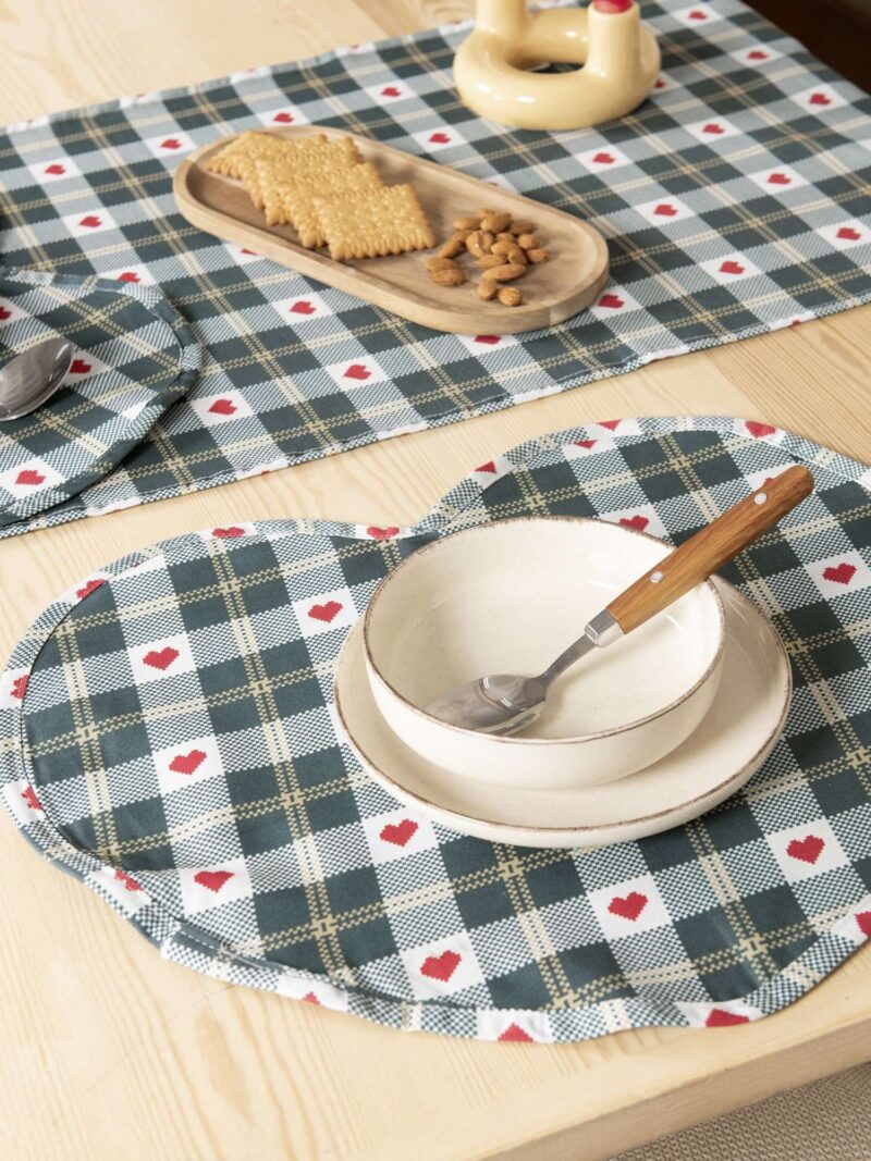 Τα Χριστουγεννιάτικα σουπλά Chrismas Love ξεχωρίζουν αμέσως χάρη στο ρομαντικό σχήμα καρδιάς που προσδίδει μια ξεχωριστή και φιλόξενη πινελιά στη διακόσμηση. Το ύφασμα είναι διακοσμημένο με ένα διαχρονικό καρό σε αποχρώσεις του σκούρου πράσινου και εμπλουτίζεται με μικρές κόκκινες καρδιές αναμεσα στα καρό μοτίβα, ενισχύοντας το μήνυμα της αγάπης και της ζεστασιάς των Χριστουγέννων. Στήστε ένα τραπέζι γεμάτο ζεστασιά με τα μοναδικά σουπλά “Christmas Love”. Το ασυνήθιστο σχήμα τους και το κλασικό σχέδιο κάνουν κάθε γεύμα μια ξεχωριστή, εορταστική εμπειρία.