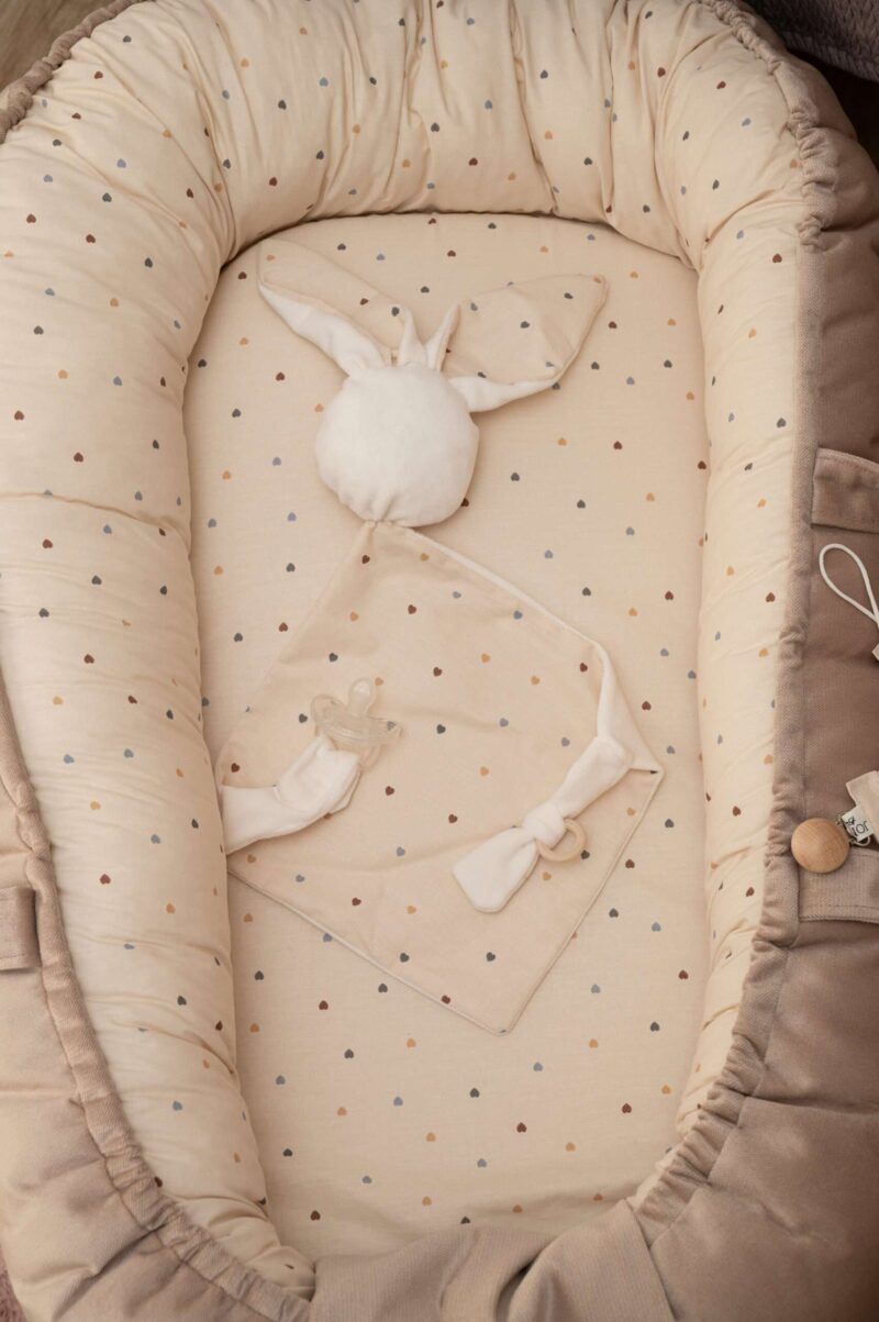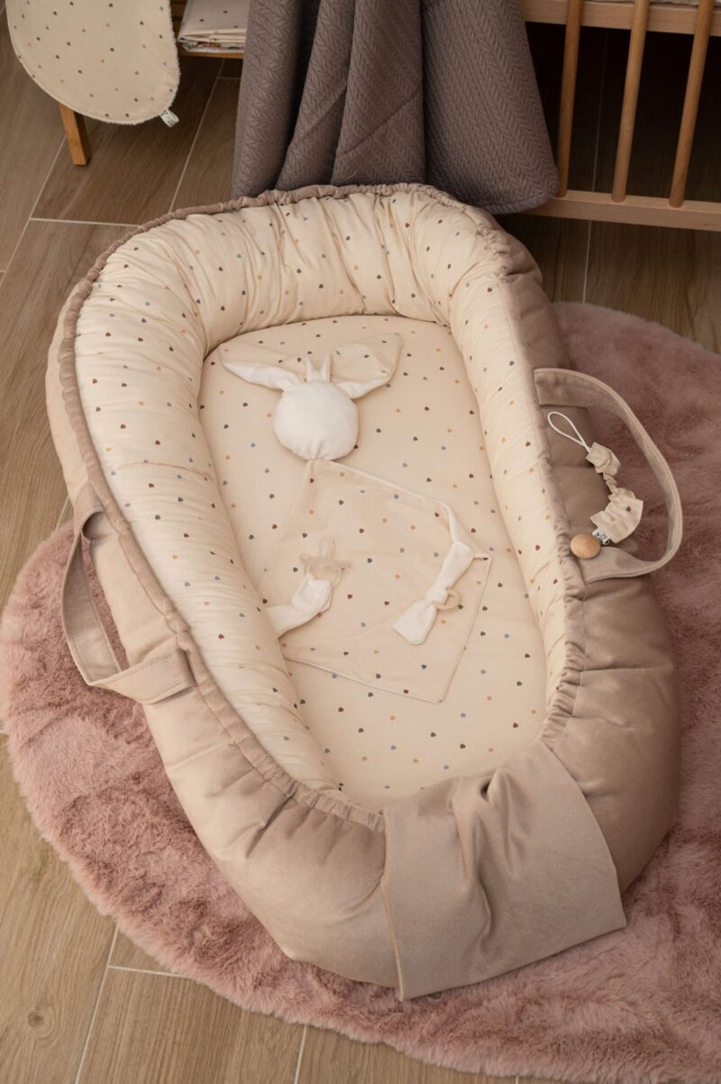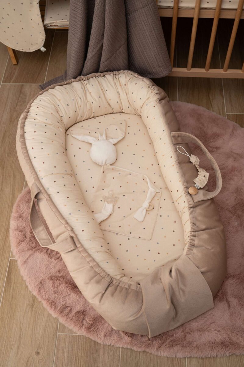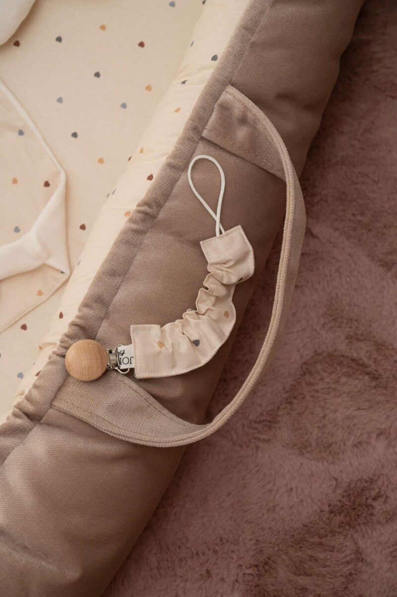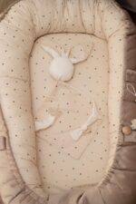 Το κάτω μέρος της φωλίτσας είναι από πιστοποιημένο μαλακό υλικό κατάλληλο για να ακουμπάει το μωρό. Το στρώμα αφαιρείται για να πλυθεί όλη η φωλιά στο πλυντήριο. Το μέγεθός της προσαρμόζεται χάρη στα ειδικά κορδόνια που καλύπτονται από το βελούδινο ύφασμα για πλήρη ασφάλεια του μωρού. Μπορεί να χρησιμοποιηθεί και από τις δυο πλευρές για χειμώνα (βελούδινη πλευρά ) καικαλοκαίρι (βαμβακερή πλευρά) .