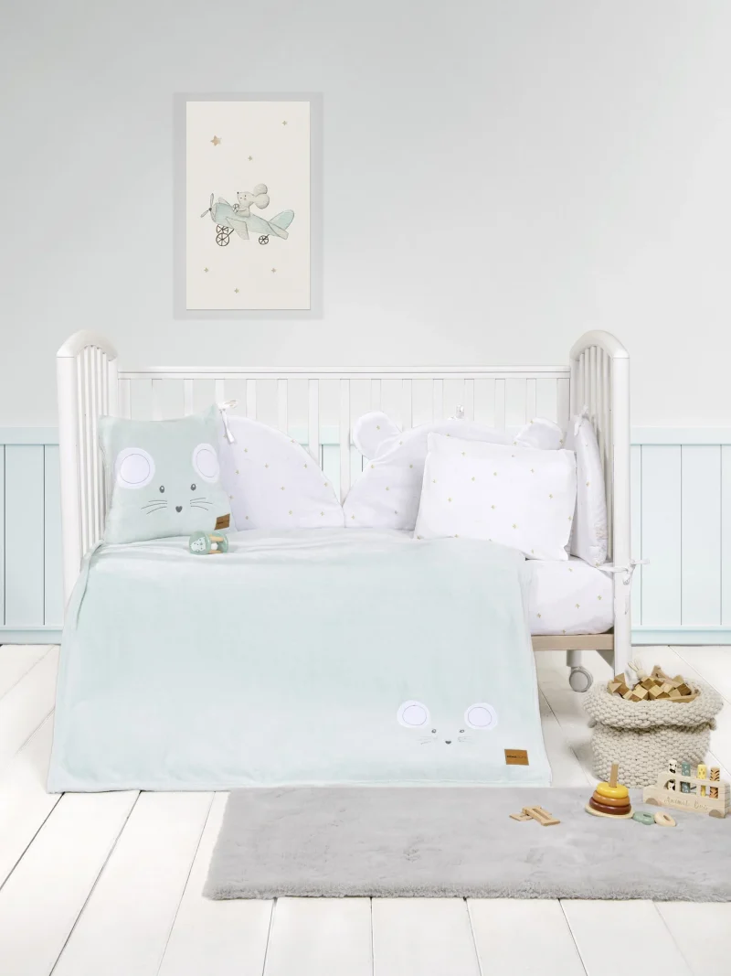 Η βρεφική κουβέρτα Mouse έχει ένα minimal και απίστευτα χαριτωμένο σχεδιασμό. Το κουβερτάκι έχει ένα απαλό, μονόχρωμο γαλάζιο φόντο και στη μία γωνία του είναι κεντημένο ένα διακριτικό, γλυκό προσωπάκι από ποντικάκι με στρογγυλά αυτιά. Η απλότητα του σχεδίου είναι που το κάνει τόσο μοναδικό και αγαπητό. Αγκαλιάστε το μωρό σας με την πιο απαλή και ζεστή αγκαλιά με το βρεφικό κουβερτάκι “Mouse”. Είναι σχεδιασμένο για να προσφέρει μέγιστη άνεση και ζεστασιά, γεμίζοντας την κούνια με τρυφερότητα. Συνδυάστε το και με το ασορτί μαξιλαράκι, για ένα ακόμα πιο όμορφο και παιχνιδιάρικο αισθητικό αποτέλεσμα!