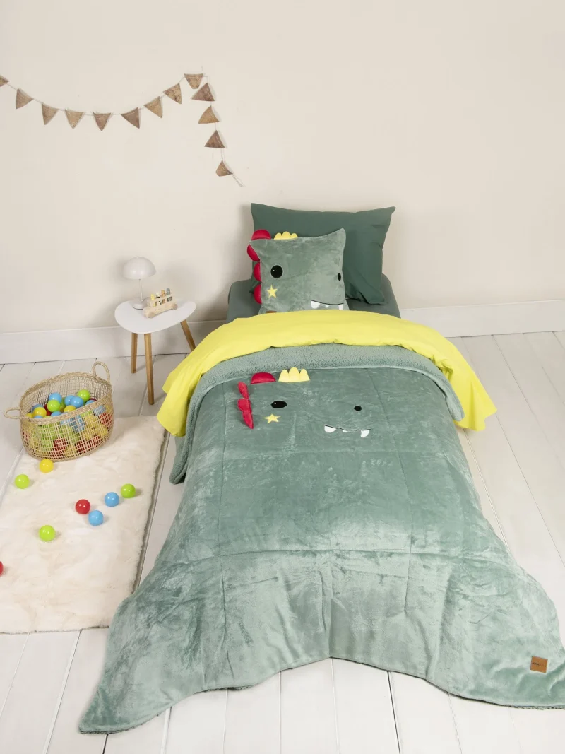 Το παιδικό κουβερτοπάπλωμα “Crocodino” μετατρέπει το κρεβάτι σε μια παιχνιδιάρικη φωλιά γεμάτη ζεστασιά και χρώμα. Σε απαλή πράσινη απόχρωση που θυμίζει το χρώμα του κροκόδειλου, στολίζεται στο κέντρο του με ένα μοναδικό 3D κεφαλάκι κροκοδείλου, έτοιμο να σου κρατήσει συντροφιά στον ύπνο αλλά και στο παιχνίδι. Οι λεπτομέρειες σε έντονο κόκκινο και το φωτεινό κίτρινο δίνουν ζωντάνια και χαρούμενη ενέργεια, ενώ το χαμογελαστό του πρόσωπο με δοντάκια και αστεράκι κλέβει την παράσταση. Ένα σχέδιο που ξεχειλίζει από φαντασία και σκανδαλιάρικη διάθεση, ιδανικό για να κάνει το παιδικό δωμάτιο ακόμη πιο μαγικό!