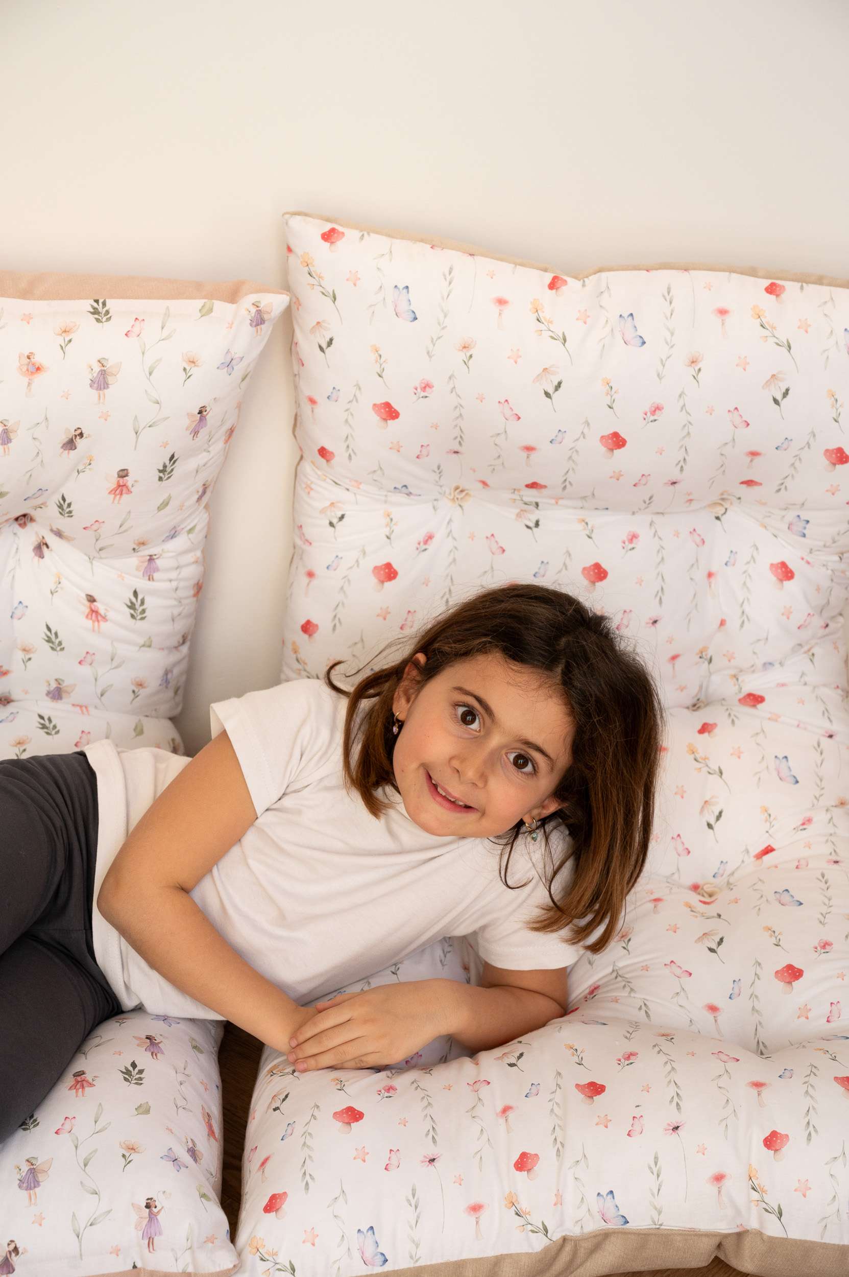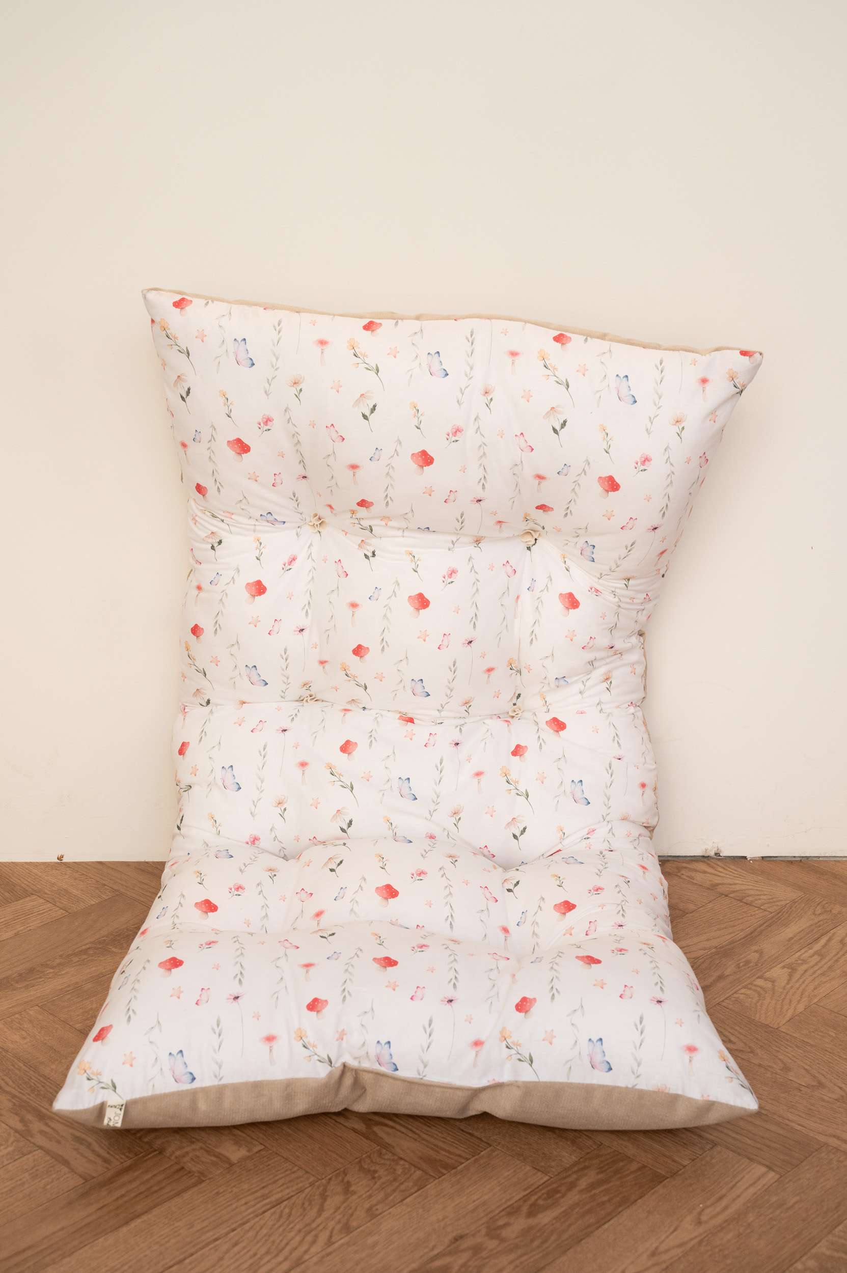 Χειροποίητη μαξιλάρα  δαπέδου πολλαπλών χρήσεων ιδανική για το παιδικό το βρεφικό δωμάτιο αλλά γιατί όχι και το καθιστικό . Το εξωτερικό ύφασμά της είναι από βαμβάκι 100% στην μία όψη και μονόχρωμο  ανθεκτικό βελούδο στην πίσω όψη. Το εσωτερικό γέμισμα είναι πολυεστερική βάτα και τρίμα .Μπορεί να χρησιμοποιηθεί σαν μαξιλάρα δαπέδου αλλά και σαν μαξιλάρα σε παγκάκι ή σε ξύλινο κουνιστό παιχνίδι (rocker).τα κρόσσια έχουν αφαιρεθεί για λόγους  ασφάλειας ,