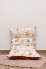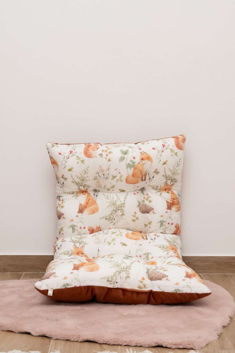Χειροποίητη μαξιλάρα δαπέδου πολλαπλών χρήσεων ιδανική για το παιδικό το βρεφικό δωμάτιο αλλά γιατί όχι και το καθιστικό . Το εξωτερικό ύφασμά της είναι από βαμβάκι 100% στην μία όψη και μονόχρωμο ανθεκτικό βελούδο στην πίσω όψη. Το εσωτερικό γέμισμα είναι πολυεστερική βάτα και τρίμα .Μπορεί να χρησιμοποιηθεί σαν μαξιλάρα δαπέδου αλλά και σαν μαξιλάρα σε παγκάκι ή σε ξύλινο κουνιστό παιχνίδι (rocker).
