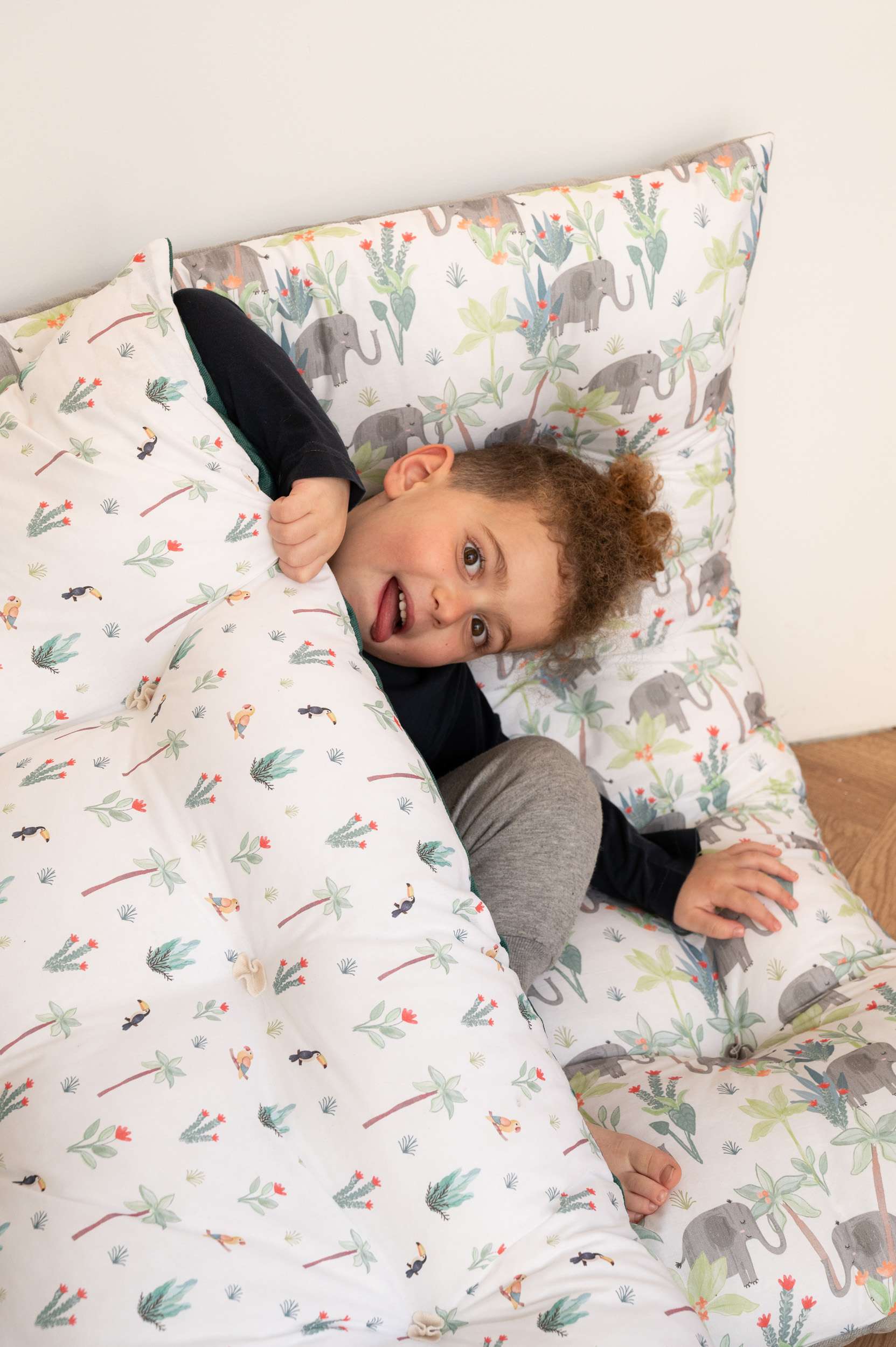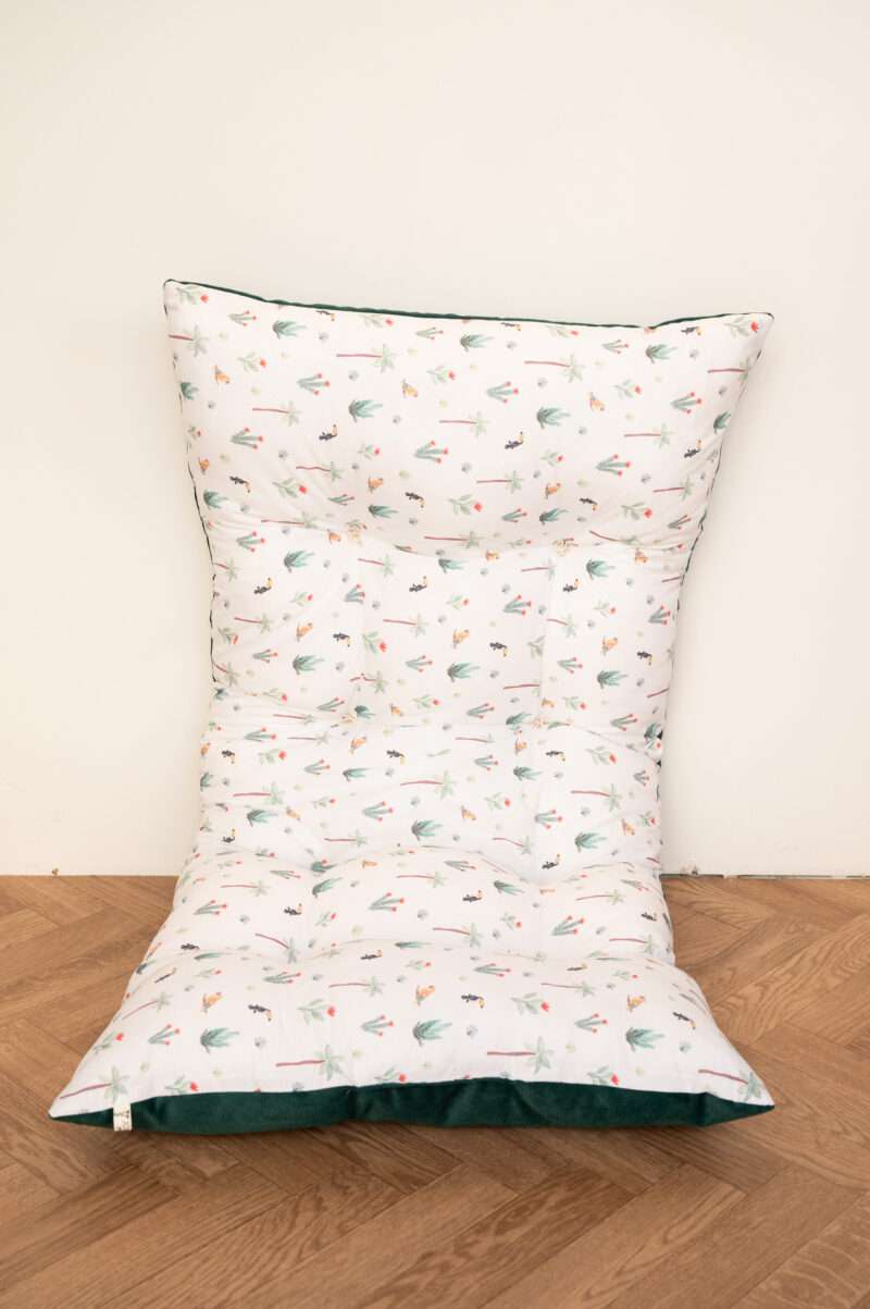 Χειροποίητη μαξιλάρα  δαπέδου πολλαπλών χρήσεων ιδανική για το παιδικό το βρεφικό δωμάτιο αλλά γιατί όχι και το καθιστικό . Το εξωτερικό ύφασμά της είναι από βαμβάκι 100% στην μία όψη και μονόχρωμο  ανθεκτικό βελούδο στην πίσω όψη. Το εσωτερικό γέμισμα είναι πολυεστερική βάτα και τρίμα .Μπορεί να χρησιμοποιηθεί σαν μαξιλάρα δαπέδου αλλά και σαν μαξιλάρα σε παγκάκι ή σε ξύλινο κουνιστό παιχνίδι (rocker).τα κρόσσια έχουν αφαιρεθεί για λόγους  ασφάλειας ,