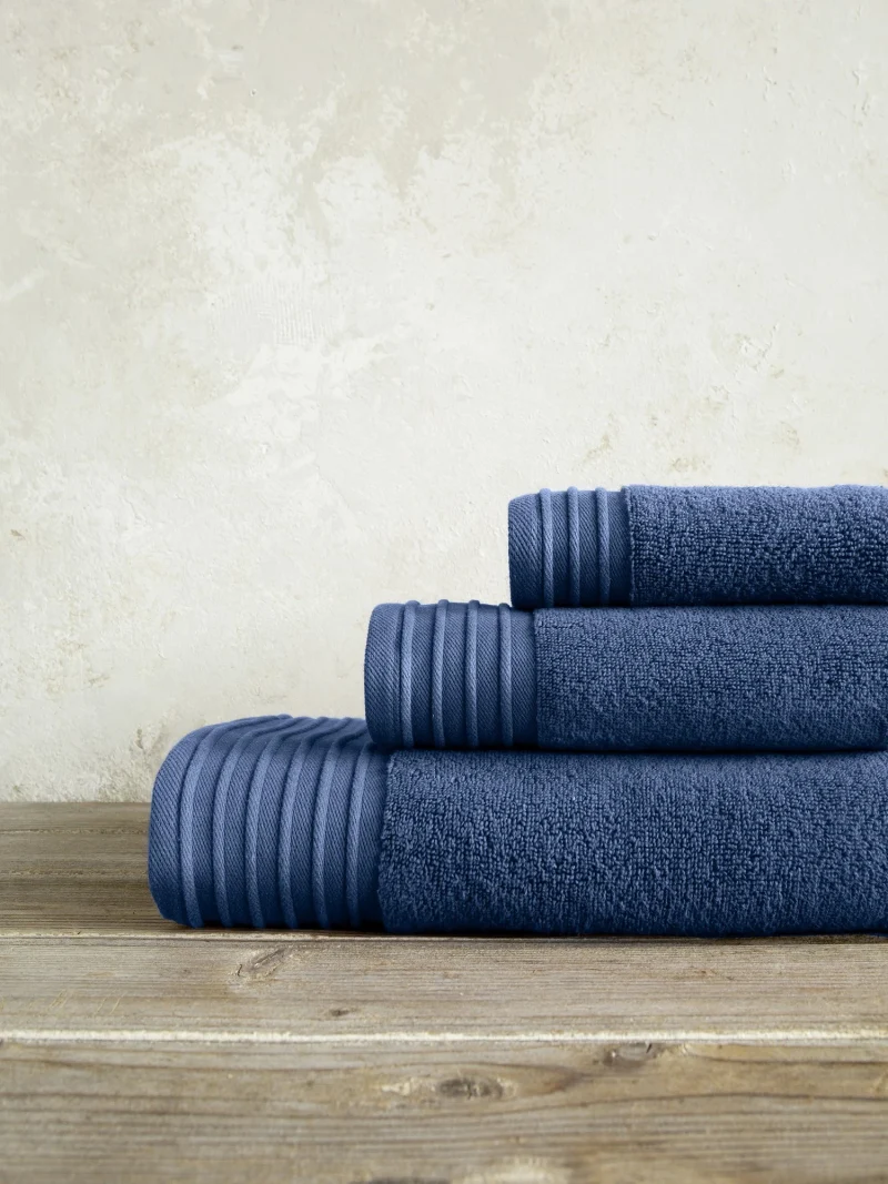 Η βαμβακερή πετσέτα Feel Fresh Aegean Blue σε βαθύ μπλέ χρώμα, θα ξεχωρίσει με την υφή και την ποιότητά της. Αποτελεί μια διαχρονική επιλογή μονόχρωμης πετσέτας με διακριτικό ανάγλυφο ριγέ σχέδιο στο τελείωμα. Προσφέρεται σε 3 διαστάσεις, χεριών, προσώπου και μπάνιου ώστε να δημιουργήσετε ομοιομορφία και ενιαία χρωματική παλέτα στον χώρο.