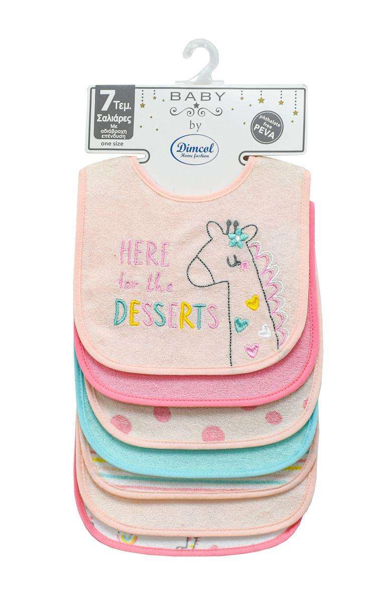 Σετ σαλιάρες 7 τεμαχίων δύο στρώσεων σε διάφορα σχέδια και χρώματα, με velcro για εύκολη εφαρμογή γύρω από το λαιμό του μωρού σας. Οι σαλιάρες είναι κατασκευασμένες από CVC Terry 180 gr/m² ύφασμα 60% Βαμβάκι & 40% Polyester στην πάνω στρώση και επένδυση από αδιάβροχο PEVA ύφασμα 90gr/m², χωρίς φθαλικές ενώσεις, στην κάτω. Το CVC ύφασμα καθιστά την σαλιάρα πολύ μαλακή, ανθεκτική προς την σμίκρυνση και τα χρώματά της ανεξίτηλα. Οι σαλιάρες είναι ελεγμένες για επιβλαβείς ουσίες με το αναγνωρισμένο παγκοσμίως πιστοποιητικό, OEKO TEX® Standard 100,
