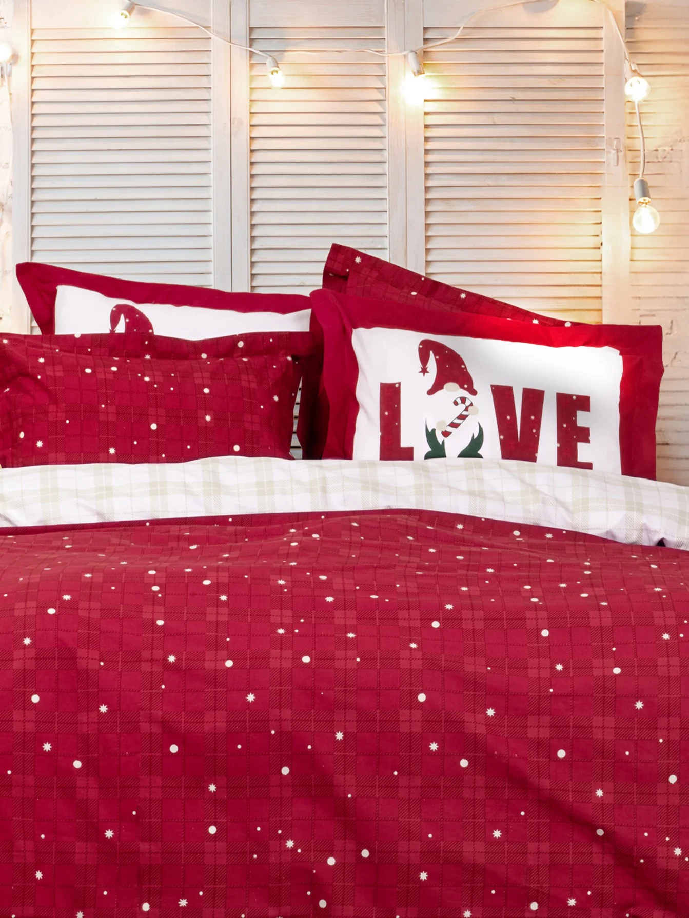Τό βαμβακερό σετ σεντονιών Everlove έχει σχέδιο που είναι εμπνευσμένο από τη γιορτινή ατμόσφαιρα. Ο κλασικός συνδυασμός του έντονου κόκκινου με τις λευκές βούλες που θυμίζουν χιόνι, προσθέτει μια παιχνιδιάρικη και ταυτόχρονα ρομαντική νότα. Οι oxford μαξιλαροθήκες που είναι πάνελ στην μία τους όψη και έχουν το γιορτινό μήνυμα “LOVE” και το χαριτωμένο σχέδιο με τον νάνο ολοκληρώνουν το μοναδικό αυτό σετ, κάνοντάς το ιδανικό για την περίοδο των Χριστουγέννων. Ετοιμαστείτε λοιπόν να φέρετε τη μαγεία των γιορτών και την ζεστασιά των Χριστουγέννων στο υπνοδωμάτιό σας με το σετ σεντονιών Everlove.