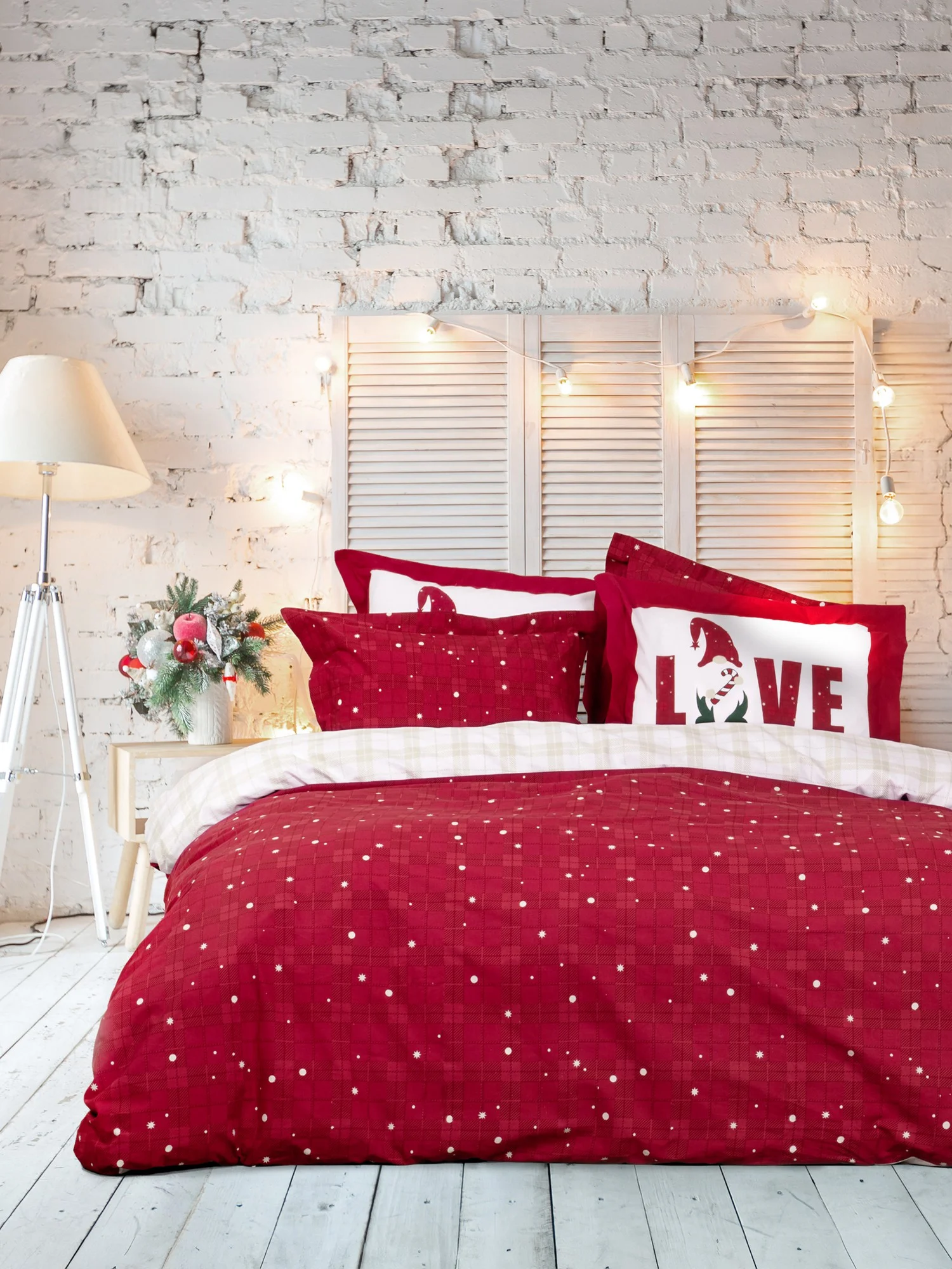 Το σετ βαμβακερής παπλωματοθήκης Everlove έχει σχέδιο που είναι εμπνευσμένο από τη γιορτινή ατμόσφαιρα. Ο κλασικός συνδυασμός του έντονου κόκκινου με τις λευκές βούλες που θυμίζουν χιόνι, προσθέτει μια παιχνιδιάρικη και ταυτόχρονα ρομαντική νότα. Οι oxford μαξιλαροθήκες που είναι πάνελ στην μία τους όψη και έχουν το γιορτινό μήνυμα “LOVE” και το χαριτωμένο σχέδιο με τον νάνο, ολοκληρώνουν το μοναδικό αυτό σετ, κάνοντάς το ιδανικό για την περίοδο των Χριστουγέννων. Ετοιμαστείτε λοιπόν να φέρετε τη μαγεία των γιορτών και την ζεστασιά των Χριστουγέννων στο υπνοδωμάτιό σας με το σετ παπλωματοθήκης Everlove.