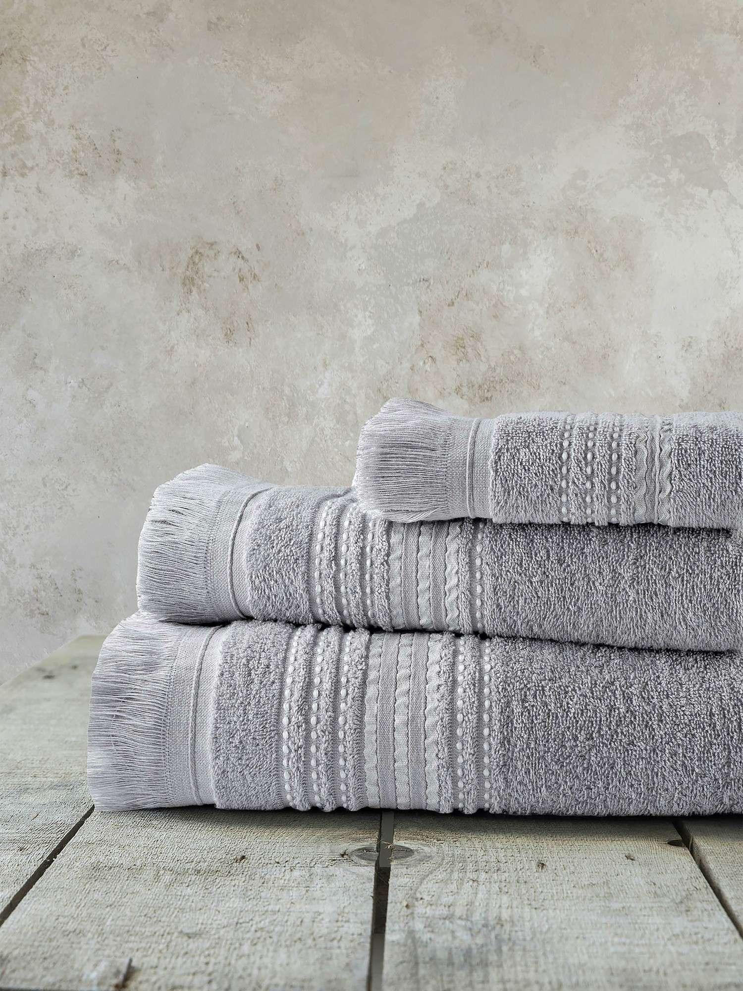 Οι βαμβακερές πετσέτες Allora Gray έχουν πλούσια υφή και μοντέρνο διαχρονικό γκρι χρώμα.Το τελείωμα της κάθε πετσέτας στολίζεται με γραμμικά σιρίτια σε χρωματική αρμονία με την βάση της, ενώ διακριτικά κρόσσια της δίνουν μια έξτρα κίνηση και εκλεπτυσμένη όψη. Θα ξεχωρίσουν για την λιτή αισθητική και την ποιότητά τους. Προσφέρονται μεμονωμένες και σε σετ τριών τεμαχίων που περιλαμβάνει μία πετσέτα μπάνιου μια προσώπου και μια χεριών. Αναβαθμίστε την εμπειρία του μπάνιου σας με την πετσέτα “Allora”, η οποία συνδυάζει την απαλότητα με ένα μοντέρνο και διακριτικό σχέδιο. Ιδανική για όσους αναζητούν την κομψότητα στην απλότητα.