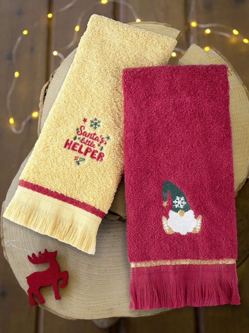 To χριστουγεννιάτικo σετ πετσέτες Elf Spirit περιλαμβάνει δύο πετσετάκια σε ζεστούς, γιορτινούς τόνους. Το ένα είναι χρυσαφί με παιχνιδιάρικο κέντημα “Santa’s little helper”, στολισμένο με χιονονιφάδες, ενώ το άλλο έχει βαθύ κόκκινοχρώμα, με κεντημένο γλυκύτατο ξωτικό με πράσινο σκούφο και λευκή γενειάδα. Και τα δύο διακοσμούνται με κομψά κρόσσια στο τελείωμα, δίνοντας μια παραδοσιακή και ταυτόχρονα παιχνιδιάρικη πινελιά. Οι ζεστοί συνδυασμοί χρυσού και κόκκινου δημιουργούν μια ατμόσφαιρα χαράς, ιδανική για τις γιορτές.