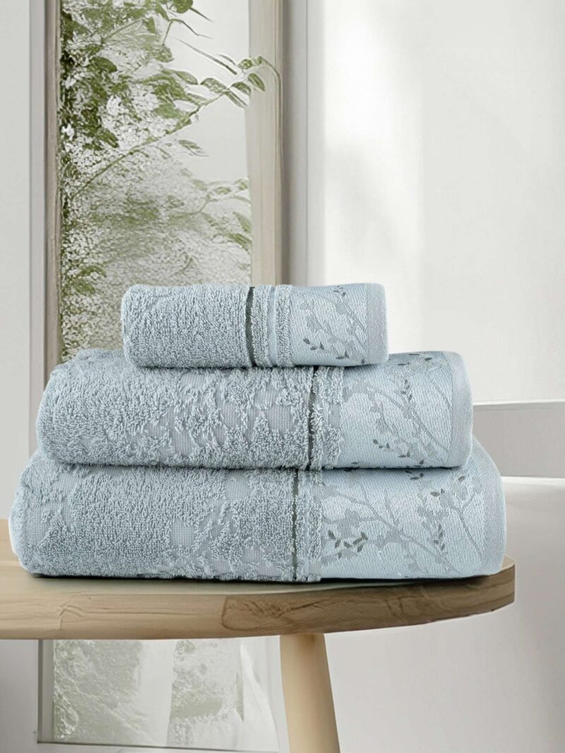 Σετ Πετσέτες Jacquard 3 τεμαχίων με σύνθεση από 100% βαμβάκι βάρους 450 gsm. Έχει πλούσια, αφράτη υφή και εξαιρετικά απαλή αίσθηση. Χάρη στη βαμβακερή της σύνθεση αναπνέει φυσικά, είναι πολύ απορροφητική, υποαλλεργική και φιλική προς το δέρμα. Προσφέρει άνετο στέγνωμα μετά το ντους ή το μπάνιο. Είναι ιδανική για καθημερινή χρήση και έχει μεγάλη αντοχή στον χρόνο καθώς διατηρεί το σχήμα και το χρώμα της ακόμα και μετά από πολλές πλύσεις, χωρίς να απαιτεί ιδιαίτερη φροντίδα.