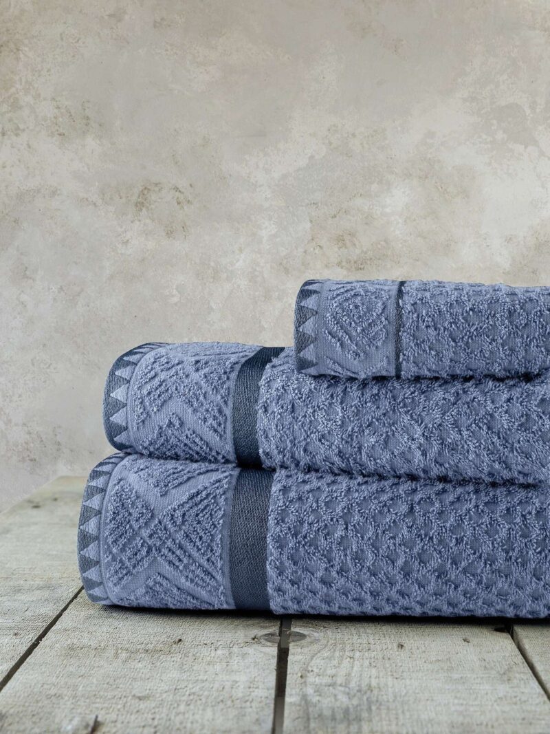 Το βαμβακερό σετ πετσέτες Reiven ξεχωρίζει για την ζακάρ ύφανσή του, μια τεχνική που δημιουργεί ένα εντυπωσιακό, ανάγλυφο σχέδιο απευθείας στο ύφασμα. Το μοτίβο είναι ένα λεπτεπίλεπτο γεωμετρικό μοτίβο, που προσδίδει στην πετσέτα βάθος και μια αίσθηση διαχρονικής κομψότητας. Το μοντέρνο μπλε χρώμα της πετσέτας έχει ένα δυναμικό χαρακτήρα και προσθέτει μια νότα πολυτέλειας και δυναμισμού στον χώρο. Συνδυάστε το σετ με το ασορτί μπουρνούζι “Reiven” της NIMA HOME και αναβαθμίστε την εμπειρία του μπάνιου σας.