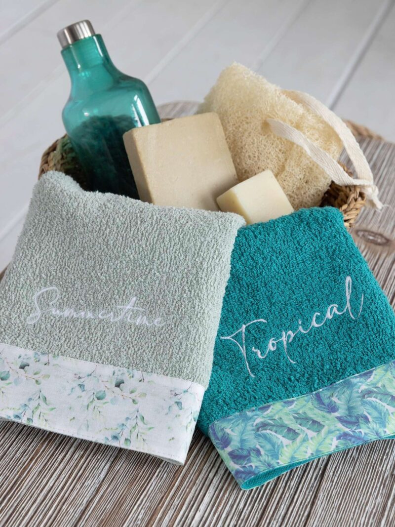 Οι πετσέτες Summertime, που θα τις βρείτε σε σετ δύο τεμαχίων, έχουν πανέμορφες αποχρώσεις του τιρκουάζ και του ανοιχτού πράσινου και κεντητό σχέδιο με τις λέξεις “Tropical” και “Summertime”. Είναι διακοσμημένες με βαμβακερή φάσα που έχει όμορφο τυπωτό σχέδιο το οποίο συνδυάζεται εξαιρετικά με το χρώμα τους. Θα σας μεταφέρουν vibes Καλοκαιρινών διακοπών και διάθεση για χαλάρωση. Ένα ξεχωριστό σετ για το μπάνιο σας ή για δώρο στα αγαπημένα σας πρόσωπα.