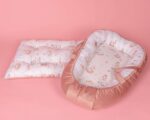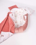 Το κάτω μέρος της φωλίτσας είναι από πιστοποιημένο μαλακό υλικό κατάλληλο για να ακουμπάει το μωρό.  Το στρώμα αφαιρείται για να πλυθεί όλη η φωλιά στο πλυντήριο. Το μέγεθός της προσαρμόζεται χάρη στα ειδικά κορδόνια που καλύπτονται από το βελούδινο ύφασμα για πλήρη ασφάλεια του μωρού. Μπορεί να χρησιμοποιηθεί και από τις δυο πλευρές για χειμώνα (βελούδινη πλευρά ) καικαλοκαίρι (βαμβακερή πλευρά) .