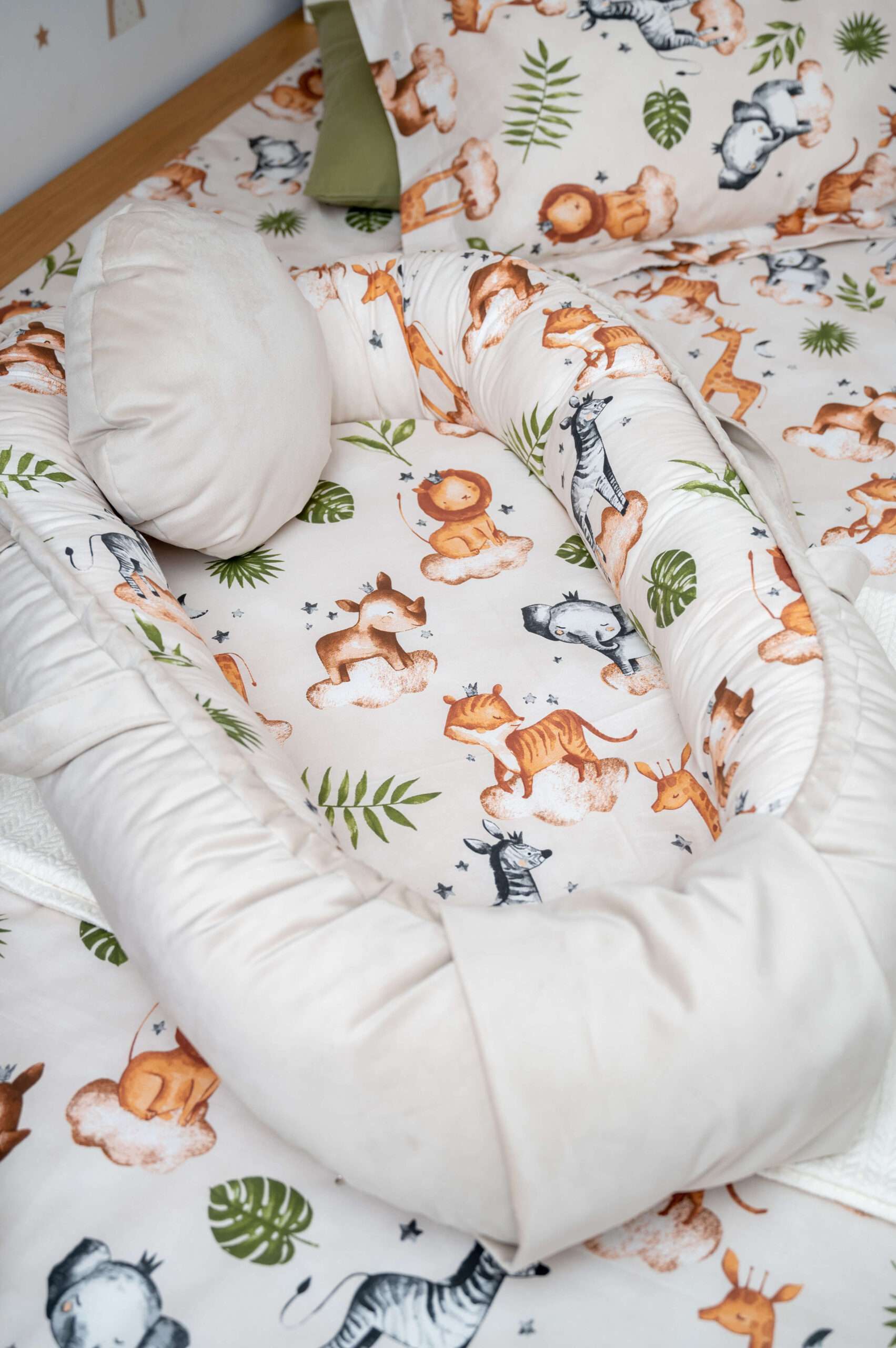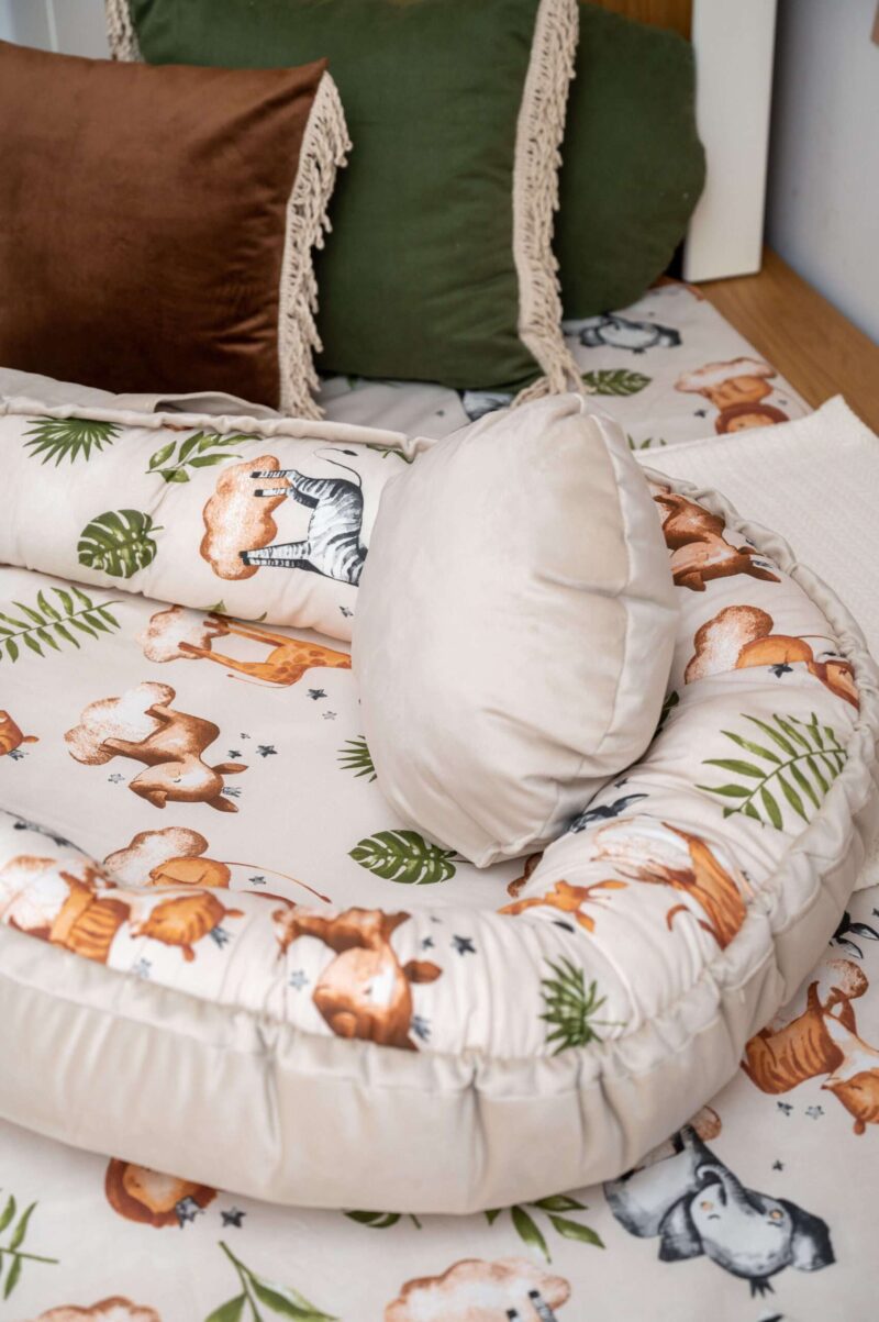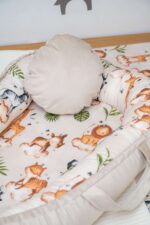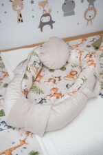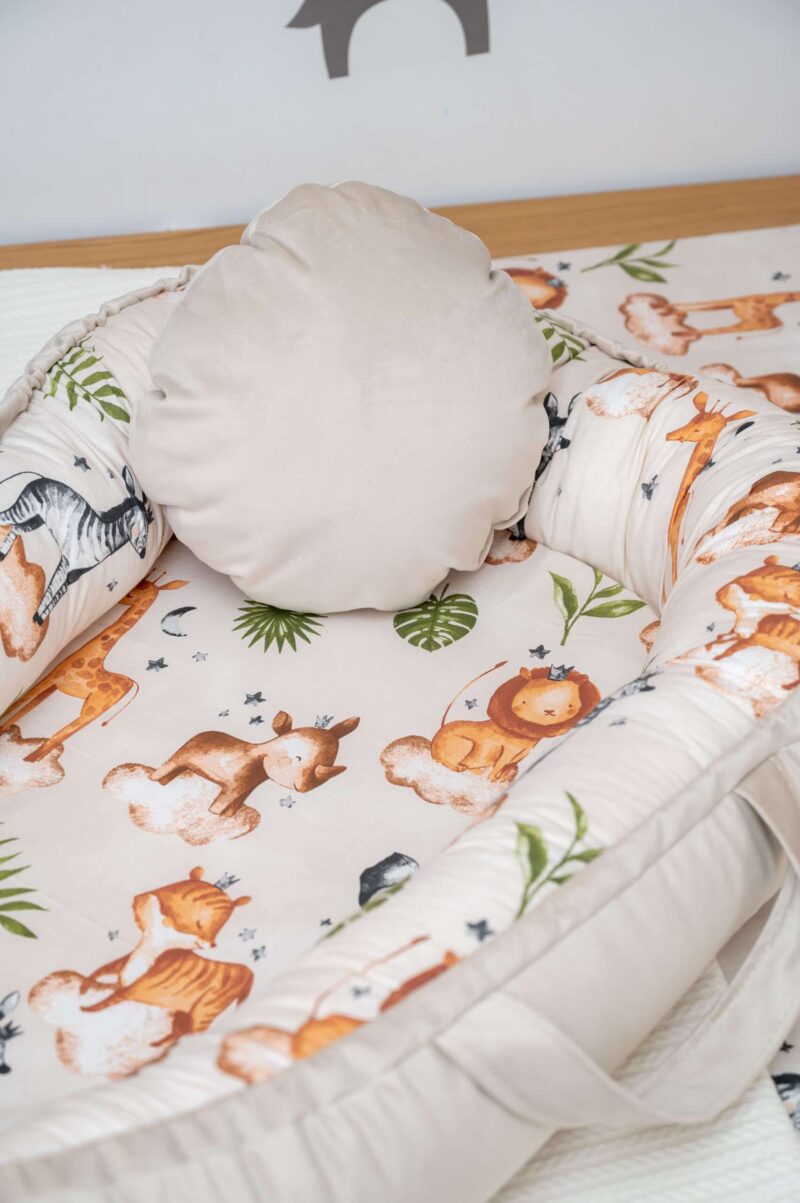 Το κάτω μέρος της φωλίτσας είναι από πιστοποιημένο μαλακό υλικό κατάλληλο για να ακουμπάει το μωρό.  Το στρώμα αφαιρείται για να πλυθεί όλη η φωλιά στο πλυντήριο. Το μέγεθός της προσαρμόζεται χάρη στα ειδικά κορδόνια που καλύπτονται από το βελούδινο ύφασμα για πλήρη ασφάλεια του μωρού. Μπορεί να χρησιμοποιηθεί και από τις δυο πλευρές για χειμώνα (βελούδινη πλευρά ) καικαλοκαίρι (βαμβακερή πλευρά) .