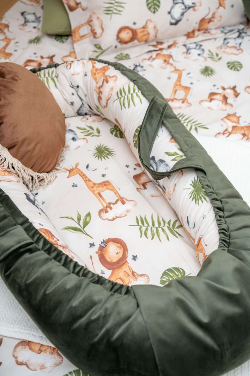 Το κάτω μέρος της φωλίτσας είναι από πιστοποιημένο μαλακό υλικό κατάλληλο για να ακουμπάει το μωρό. Το στρώμα αφαιρείται για να πλυθεί όλη η φωλιά στο πλυντήριο. Το μέγεθός της προσαρμόζεται χάρη στα ειδικά κορδόνια που καλύπτονται από το βελούδινο ύφασμα για πλήρη ασφάλεια του μωρού. Μπορεί να χρησιμοποιηθεί και από τις δυο πλευρές για χειμώνα (βελούδινη πλευρά ) καικαλοκαίρι (βαμβακερή πλευρά) .