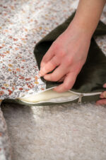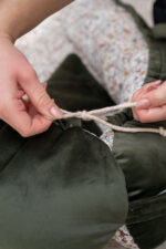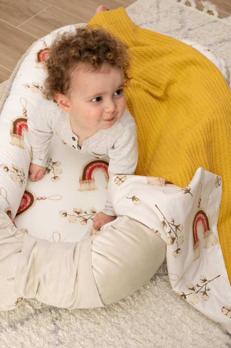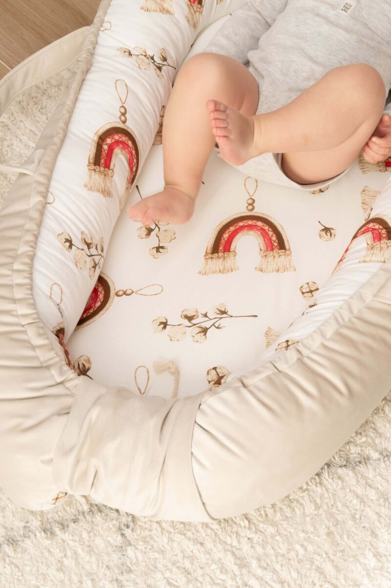 Διαθέτει στο κάτω μέρος της πιστοποιημένο μαλακό υλικό κατάλληλο για να ακουμπάει το μωρό. Το στρώμα αφαιρείται για να πλυθεί όλη η φωλιά στο πλυντήριο. Το μέγεθός της προσαρμόζεται χάρη στα ειδικα κορδόνια που καλύπτονται από το βελούδινο ύφασμα για πλήρη ασφάλεια του μωρού.